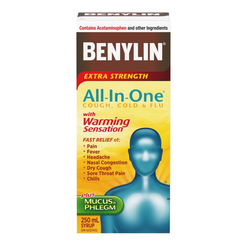 Benylin Extra Strength All-In-One Cough, Cold and Flu With Warming Sensation Syrup (250 ml) is a fast-acting syrup designed to effectively relieve symptoms associated with colds, flu and cough. This product includes a unique formula that offers complete relief for various symptoms such as cough, nasal congestion, sore throat, body ache and fever, while providing a comforting and warming sensation during use.
