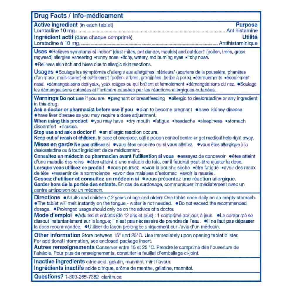 Claritin Rapid Dissolve is an antihistamine medication designed to relieve allergy symptoms for 24 hours without causing drowsiness. Each tablet contains 10 mg of loratadine and quickly dissolves in the mouth without the need for water, facilitating administration anytime and anywhere. It is formulated to alleviate symptoms such as sneezing, runny nose, watery eyes, and itching of the nose or throat caused by common allergens like pollen, dust mites, pet dander, and mold. Adults and children over 12 years old are advised to take one tablet daily, without exceeding this dose. This product is suitable for those seeking effective and convenient relief from allergy symptoms without experiencing drowsiness.