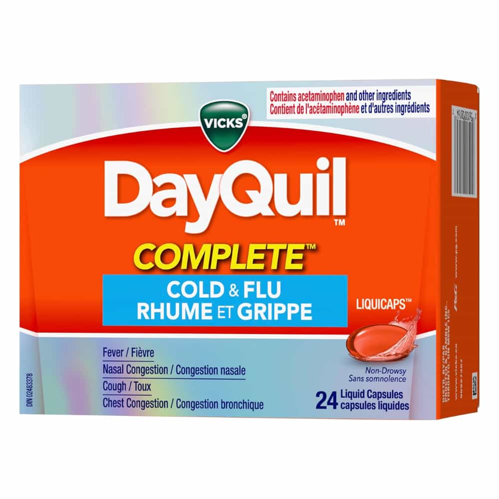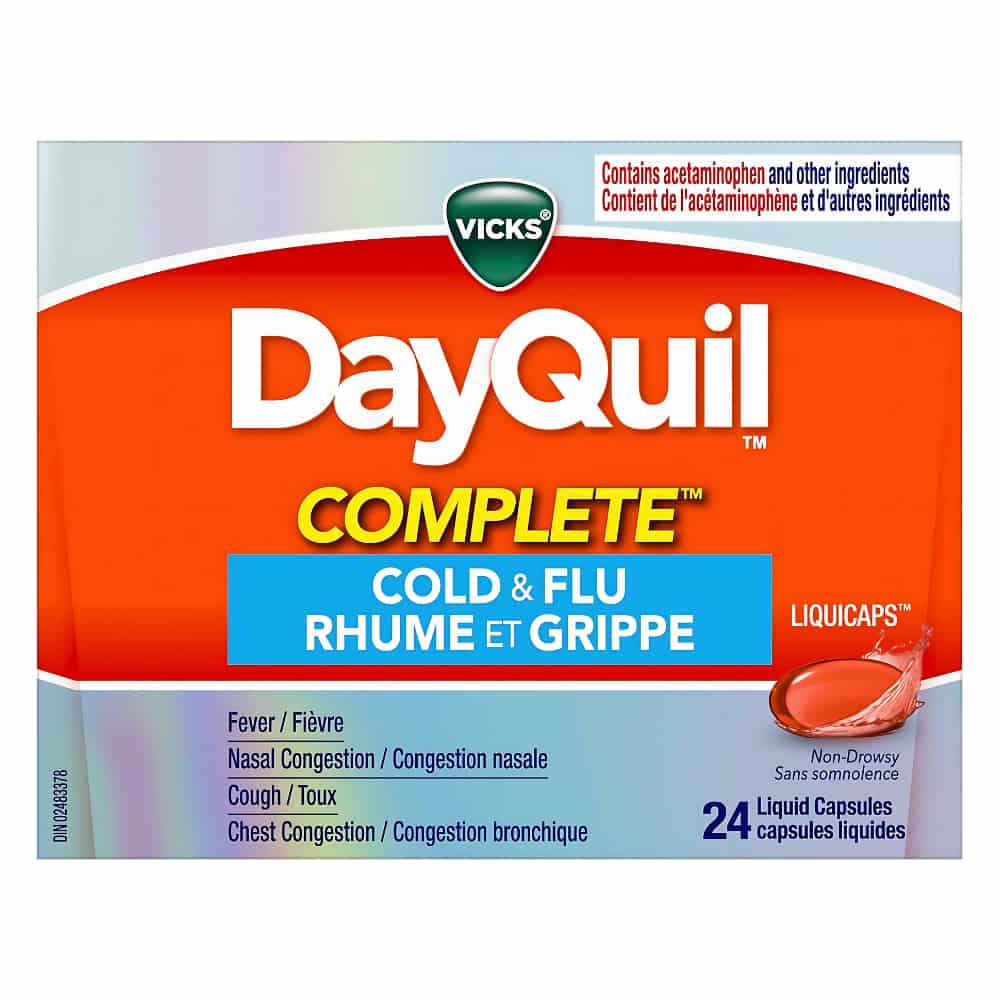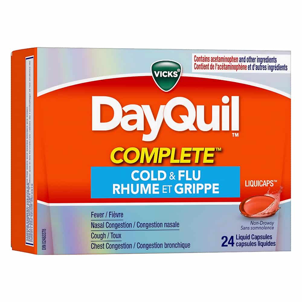 Vicks DayQuil COMPLETE Cold & Flu Daytime Relief LiquiCaps provide comprehensive, non-drowsy relief from multiple cold and flu symptoms. This package contains 24 liquid capsules formulated to alleviate headaches, fever, sore throat, minor aches, nasal congestion, sinus pressure, and cough caused by minor throat and bronchial irritation. Active ingredients include acetaminophen as a pain reliever and fever reducer, dextromethorphan HBr as a cough suppressant, and phenylephrine HCl as a nasal decongestant. It's important to follow the dosing instructions and consult a healthcare professional if symptoms persist.